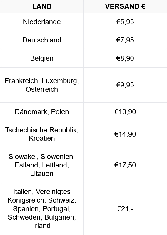 Die voraussichtliche Lieferzeit ist je nach Land unterschiedlich: Bestellungen in die Niederlande, Belgien und Deutschland werden innerhalb von 3 Arbeitstagen geliefert. Bestellungen in andere EU-Länder werden innerhalb von 5 bis 10 Werktagen geliefert.
