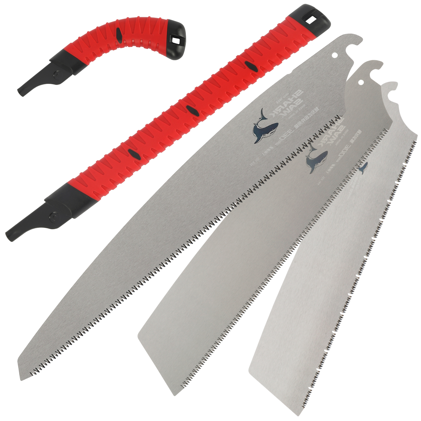Wechseln Sie die Griffe und Sägeblätter je nach Arbeit. Verwenden Sie den langen Griff für zusätzliche Kontrolle und den kurzen Griff für zusätzlichen Halt bei größeren Werkstücken und nassem Holz.
