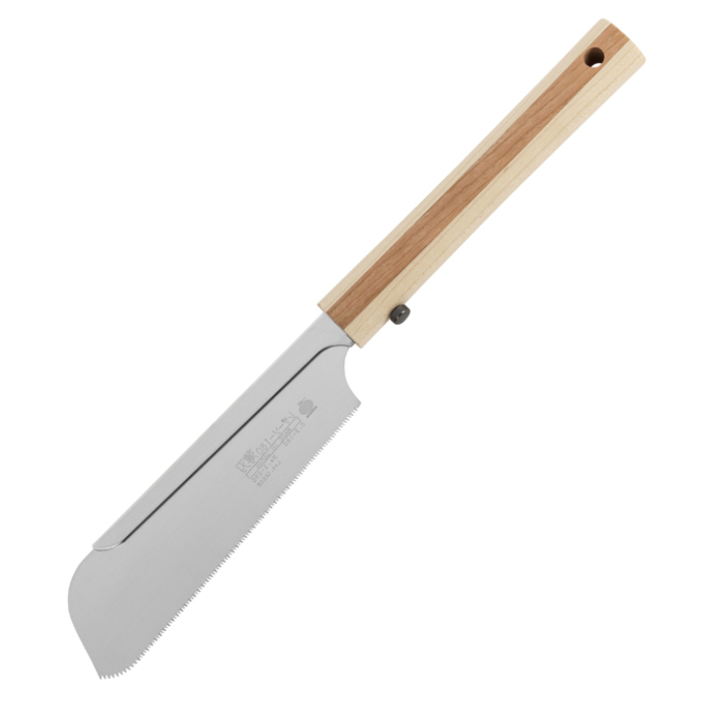 Die Säge ist mit einem traditionellen Holzgriff versehen, gefertigt aus natürlichem Ahorn- und Kirschholz. Zudem lassen sich die Sägeblätter einfach austauschen.