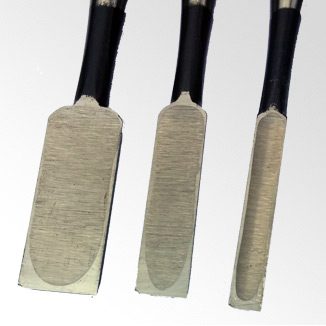 Diese semi-professionellen japanische Stemmeisen bestehen aus zwei Teilen. Ein weicheres Teil das in dem Handgriff steckt und eine bedeutend härtere Schneide. Die harte Schneide sorgt für einen perfekten Holzschnitt und der weichere Teil dämpft die Schläge effizient. Die Stemmeisen wurden aus 2 Schichten hochwertigen Kohlenstoffstahls produziert und haben eine hohle Rückseite. Diese hohle Rückseite macht das Arbeiten und Schleifen einfacher. Der Schlagring hinten auf den Stemmeisen verlängert die Lebensdauer der Handgriffe beträchtlich und ist leicht auf dem Handgriff anzubringen. Je mehr die Stemmeisen genutzt werden, desto fester werden die Schlagringe sitzen. Dieses Set ist gut geeignet für den weniger erfahrenen Tischler und liefert trotzdem ausgezeichnete Resultate.